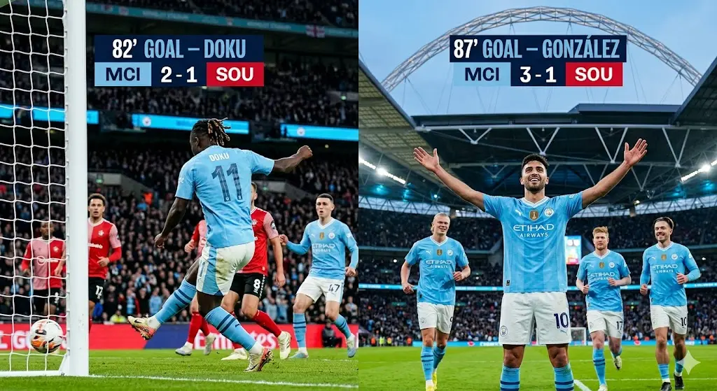 Jeremy Doku (82’) and Nico González (87’) score late as Manchester City complete a comeback against Southampton in the FA Cup semi-final at Wembley Stadium.